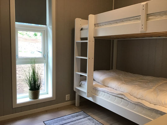 Hyttene har totalt 8 sengeplassar fordelt på 4 soverom. Tre på hovudplan og eit på hemsen. Stort soverom med dobbelseng (180cm) som kan delast til to enkle sengar på 90cm. To av soveromma har køysenger (90/90cm). På hemsen er det to enkle sengar (90cm).